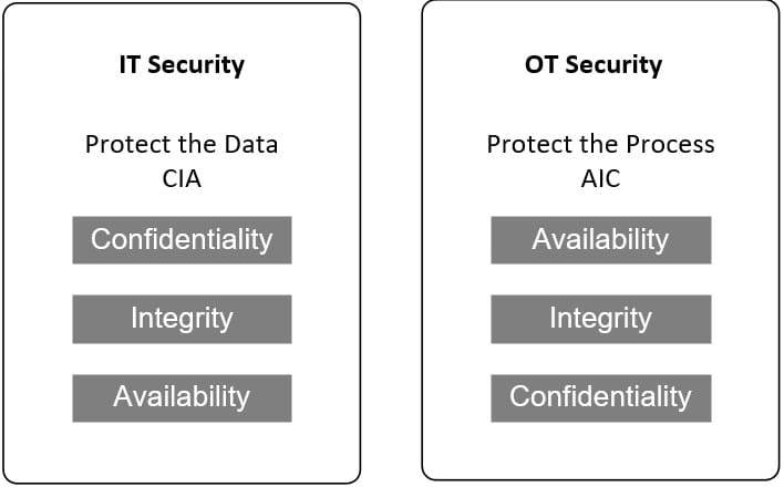 The CIA (Confidentiality, Integrity, and Availability) triad was a standard methodology for protecting data in information systems. However, with OT systems, the focus is on the integrity and availability of the system itself, with this triad rotated to AIC. (Availability, Integrity and Confidentiality) with an emphasis on the stability and availability of the system itself, with a safety-first view. This is shown in the diagram below: